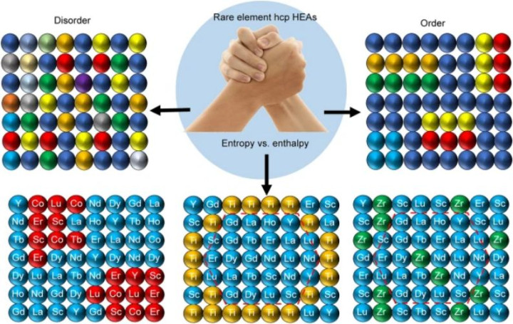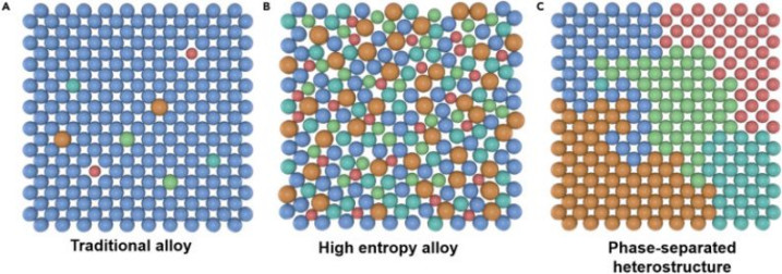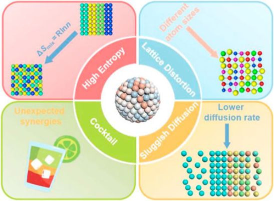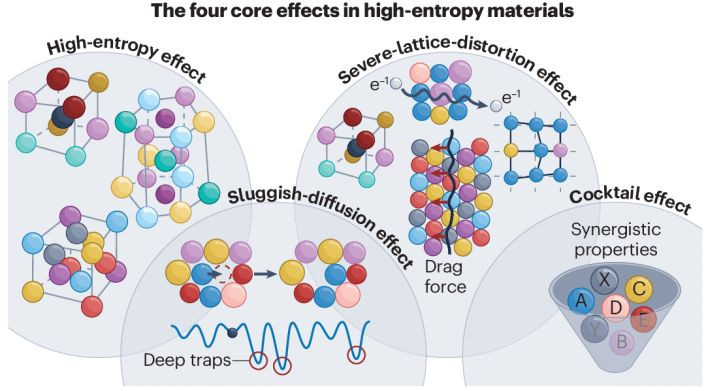 1.高熵效应:以不同颜色球体表示多元素随机分布,公式量化熵值。当元素数n=5时,ΔS=1.61R,显著高于传统合金(n=2时ΔS=0.69R)。