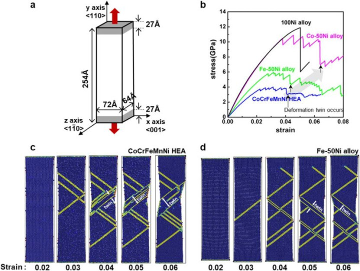 力学测试显示,随着温度从298K降至77K,屈服强度从350 MPa升至800 MPa,同时延伸率从60%增至90%。这种反常的温度依赖性源于两方面:1)低温抑制位错交滑移,促进孪生;2)多元素固溶强化使派-纳力(Peierls stress)升高。研究还通过分子动力学模拟验证了孪生临界应力(τₜ=1.2 GPa)与实验值(1.1 GPa)的高度吻合。
