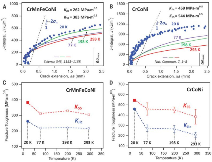 Gludovatz等人在《Science》发表的论文“A fracture-resistant high-entropy alloy for cryogenic applications”[78]系统研究了CrMnFeCoNi(Cantor合金)的低温性能。该研究通过透射电镜(TEM)观察到在77K时,变形机制从室温下的平面位错滑移(图5a)转变为纳米孪生,孪晶厚度约10nm,间距50nm。这种孪生诱导的塑性(TWIP效应)使合金在低温下仍保持高应变硬化能力,断裂韧性从室温的212 MPa·m¹/²提升至77K时的275 MPa·m¹/²。