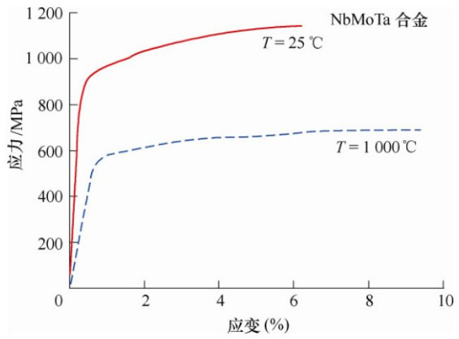 应力-应变曲线显示NbMoTa合金在25℃和1000℃下的力学响应:低温时屈服强度达1.8 GPa(高于Inconel 718的1.2 GPa),高温下仍保持1.1 GPa,且应变硬化率(dσ/dε=5 GPa)表明持续的孪生/位错交互作用。