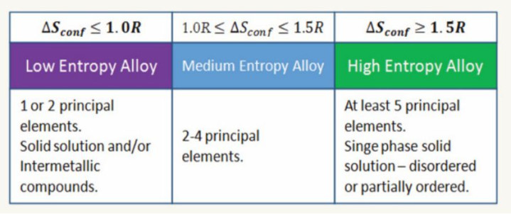 高熵合金(High-Entropy Alloys, HEAs)是一种由五种或更多主元素以接近等原子比例(5%-35%)组成的多组分合金体系,其核心特征是混合熵(Configurational Entropy)显著高于传统合金。根据玻尔兹曼热力学原理,混合熵的计算公式为